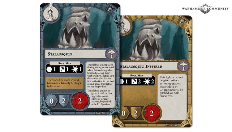 Stalasquig is a Squig possessing rock. Now immobile but hungry, this creature sits around nobbling away at unsuspecting targets. He has a 1 smash 1 damage attack with 2 block and 2 wounds. He has movement 0, cannot be pushed, given attack action upgrades, move, charge or hold objectives. So what is good about him?