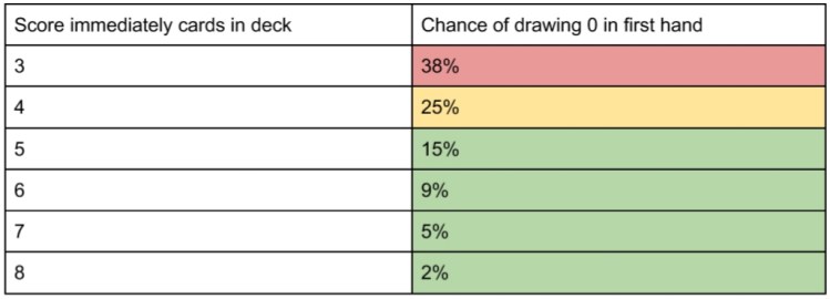 So if we want at least one score instantly card in our first hand then we need to include at least 5, this would result in only one in every 7ish [Mathmatically accurate] games not fulfilling this criteria. More would be better as this increases the reliability of getting the desired result.