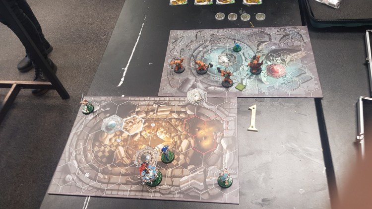 Ironskull’s Boyz headed by Darrel was my first opponent. Losing boards he placed the Mirror Well so I placed the new Forbidden Chambers board. I’ll call it the Amber Catacomb (with the other being the Shattered Refractor). I set the boards in diagonal configuration.
