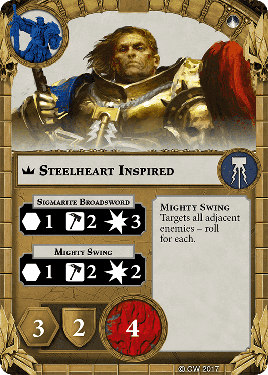 Upon inspiring he goes up to 2 block making him even tougher to kill if you lack cleave or multiple attack dice. His attack remains unchanged but now he gets Mighty Swing which targets all adjacent enemy fighters. This makes him a reliable blender against more numerous horde warbands which the elite Stormcast Eternals generally struggle with.