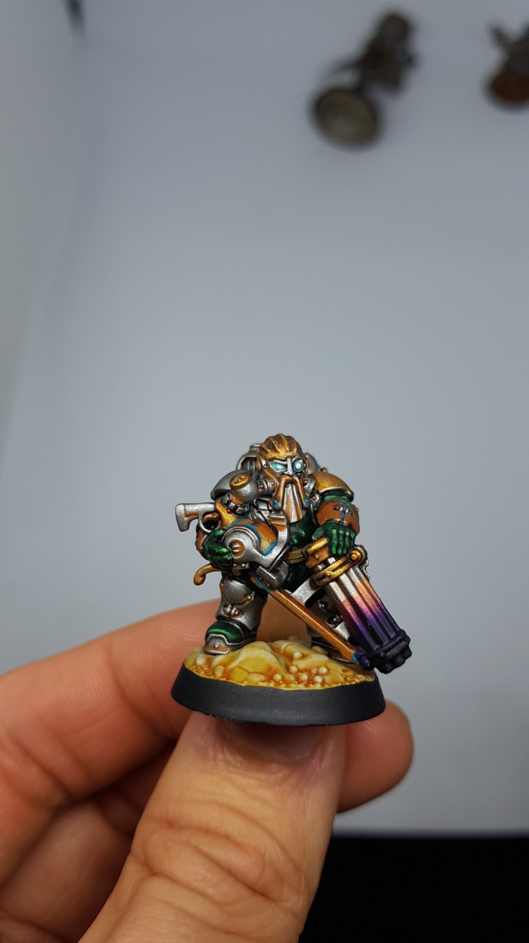 For Iromhail’s Athermatic Volleygun I wanted a hot metal look. I masked the model with silly putty then airbrushed Scale 75 Copper 75% up the barrel. Once dry I airbrushed Vallejo Game Air (VGA) Hexed Lichen 50% up the barrel. VGA Imperial Blue was airbrushed 25% and then the tip was airbrushed Vallejo Model Colour Black.