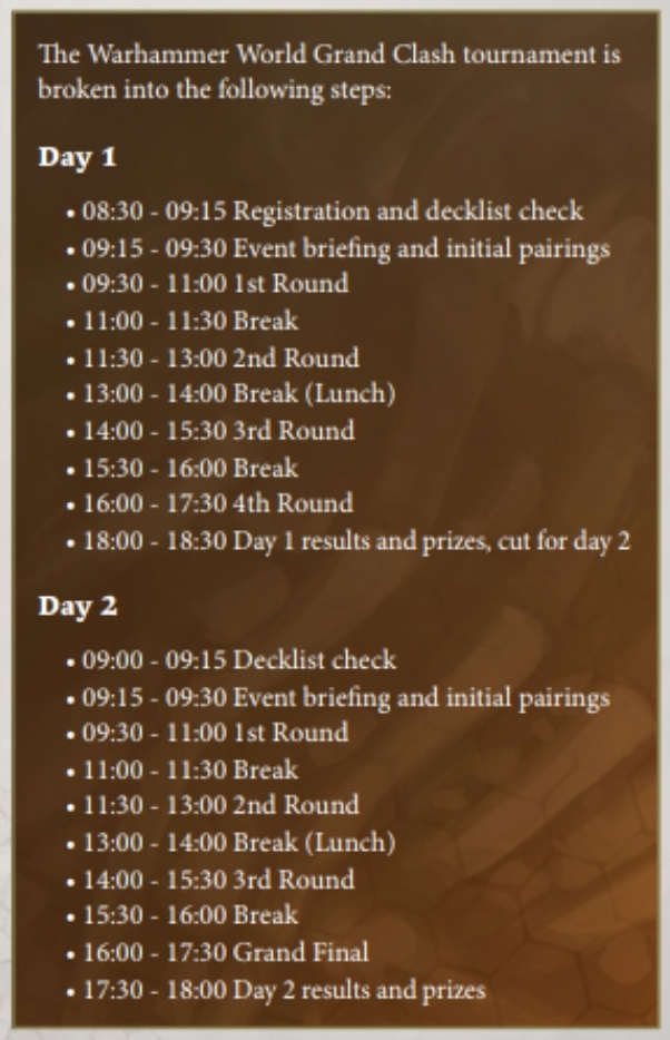 As many of you know Grand Clashes have transitioned over to 2 day format. After the July Warhammer World Grand Clash a few changes have been made to the system. These will help improve the experience for casual and competitive players alike to bring the World’s best Underworlds event. Here’s what the schedule looks like now: