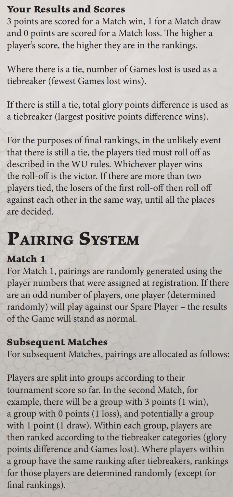 Results and tiebreakers remain the same. 3 for a win, 1 for a draw, 0 for a loss with losses then glory differential used as tie breakers. The roll-offs only occur for final placements at the end of the tournament and not after a round result.