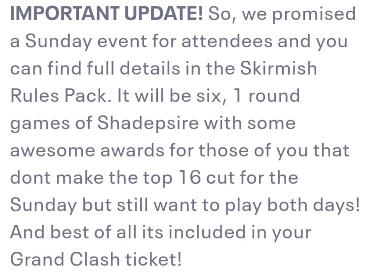 Great news. The July Grand Clash couldn’t hold a Skirmish event due to various issues but it’s awesome to see it implemented for the October clash. Win or lose, you’ll always have something to play.