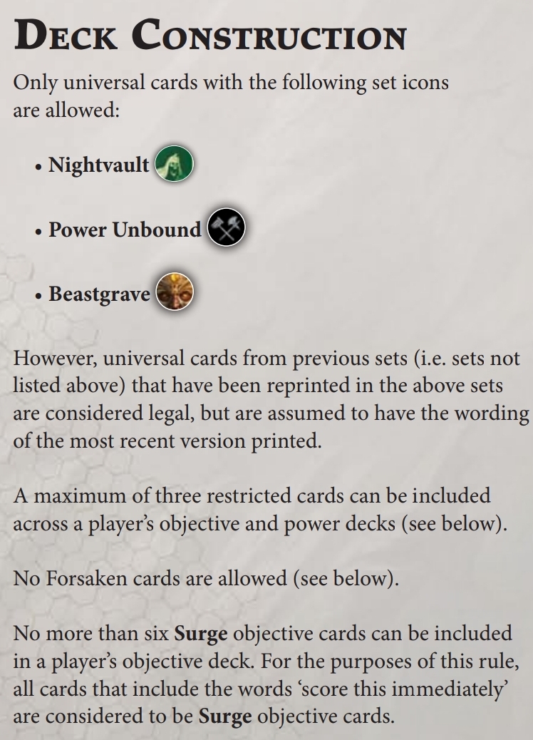 As you can see with the above images, you faction fighters and cards will always be usable. Currently only universal cards released during Nightvault and Beastgrave are legal in competitive play. Any Shadespire cards reprinted during those 2 aforementioned seasons are still usable too (like the Hold Objective cards and Sidestep for example).