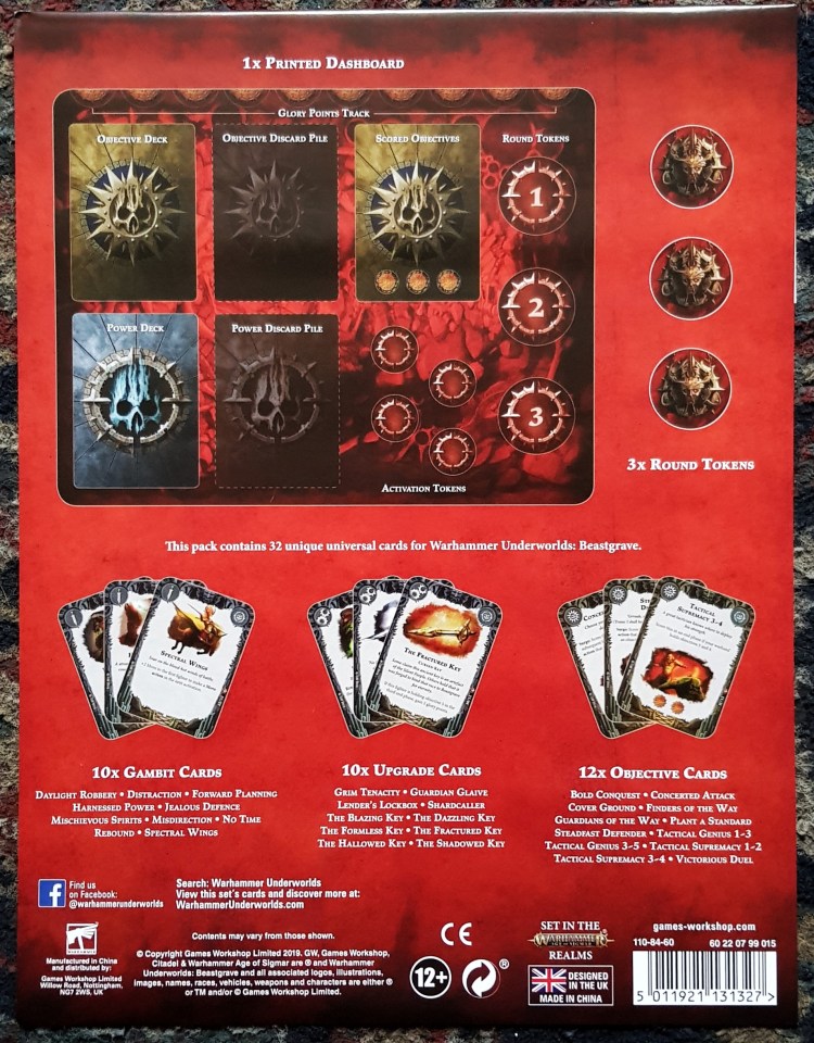 Welcome to my product review for the Warhammer Underworlds Beastgrave Gift Pack! Once again thanks to Games Workshop for giving me this to review for free. The gift pack is a new edition to Underworlds. This is packed with a playable 32 card deck containing 12 universal objectives and 20 universal power cards. It also comes with a dashboard and textured metal round tokens to help organise how you play.