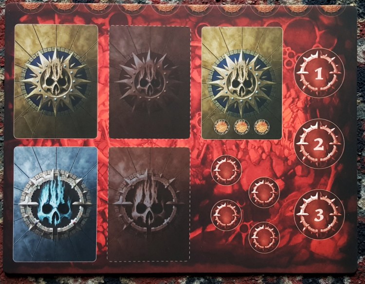 You once again have 2 piles for objectives and scored objectives, 3 textured metal round counters to track which round it is and glory points marked at the top in semicircles for you to place them above the dashboard. The playmat is made of thick triple layered card while still being matte. Very nice quality.