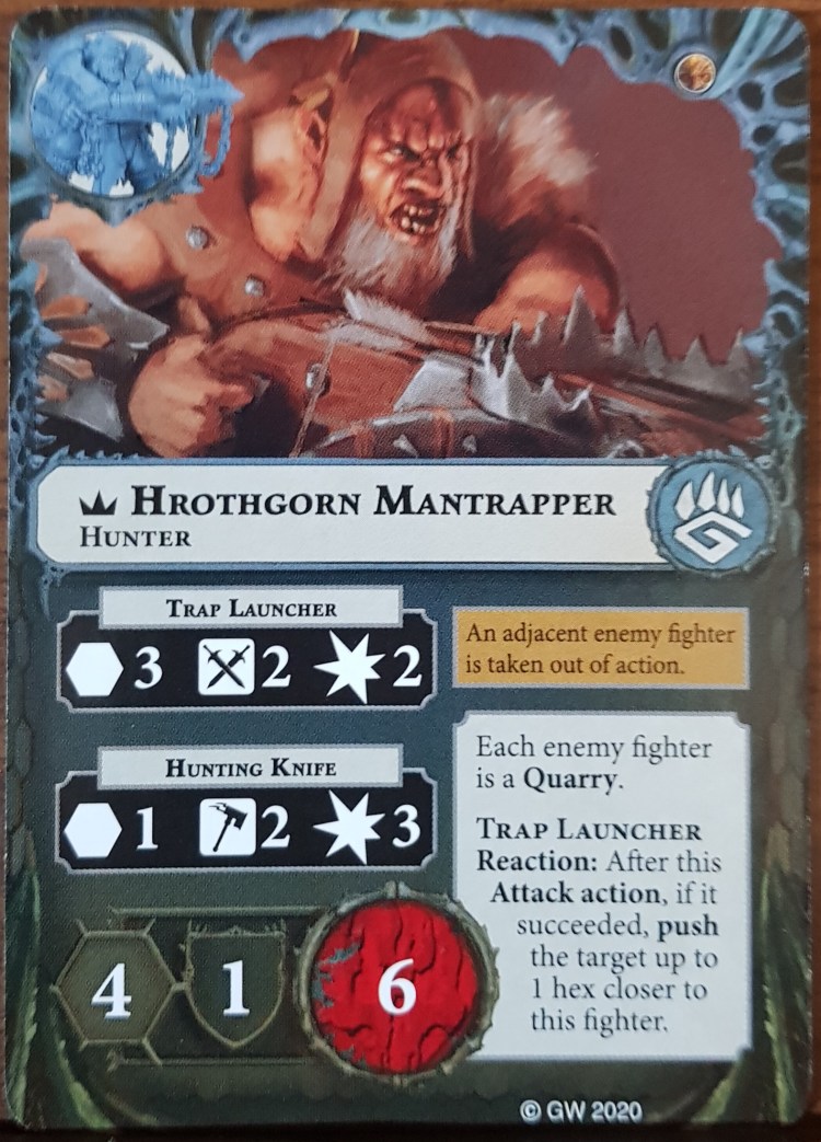 Hrothgorn Mantrapper is your leader and mighty Ogor! He’s armed with a Trap Launcher which is range 3, 2 fury, 2 damage and can push a target 1 hex closer to Hrothgorn after the attack action if it succeeded. He also comes with a Hunting Knife which is range 1, 2 smash and 3 damage. He has a move characteristic of 4, defends on a single block and has 6 wounds.