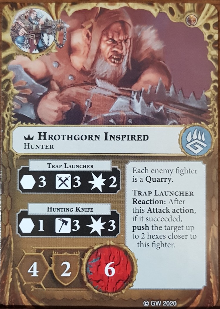 Hrothgorn Inspired has his Trap Launcher go up to 3 fury and on a successful hit he pushes the target up to 2 hexes closer instead. Get over here! His Hunting Knife goes to 3 smash which makes him even more reliable. He also goes up to 2 block, increasing his durability.