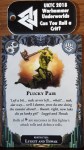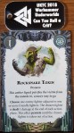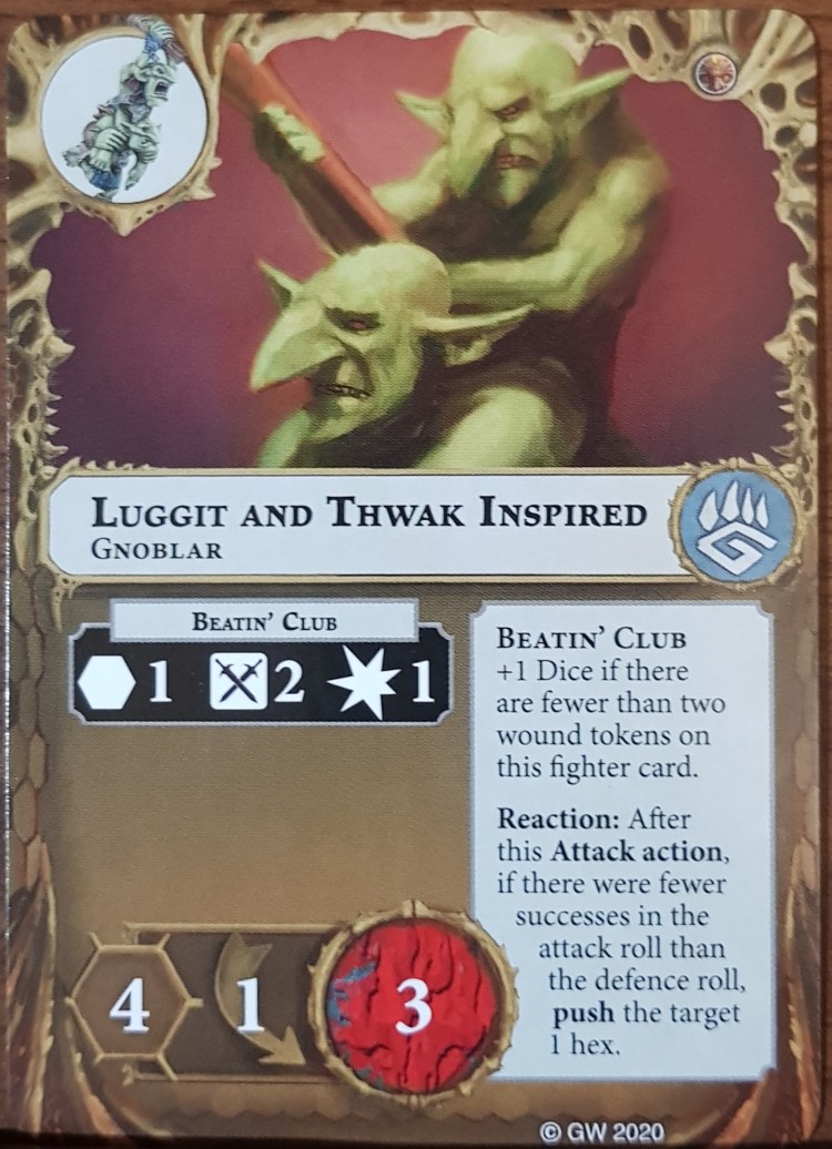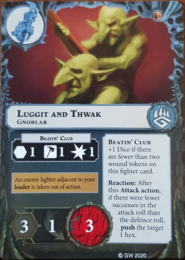 Luggit and Thwak are the deadliest combination of fighters in Warhammer Underworlds; 2 Gnoblars stacked on top of each other! They’re armed with a Beatin’ Club which is range 1, 1 smash and 1 damage. They are movement 3, 1 dodge and have 3 wounds. They have the ability that as long as there are fewer than 2 wound tokens on this fighter, the Beatin’ Club gets +1 dice. It also has a special reaction. If you have fewer success rolls in the attack roll compared to your opponent’s defence roll, you get push the target. In any direction. It’s a big club.