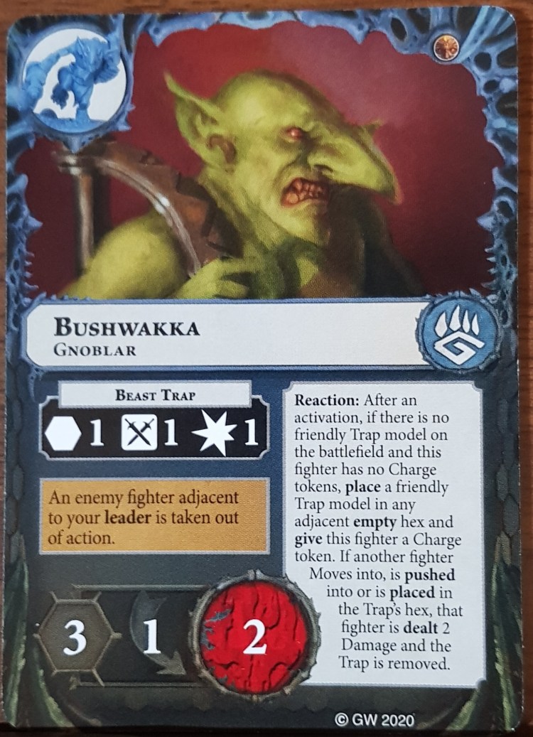 Buswakka is your final Gnoblar and most likely Australian. He’s armed with a Beast Trap which is range 1, 1 fury, 1 damage. He’s also movement 3, 1 dodge and 2 wounds. What makes him really special is his reaction. After any activation, there is no trap model on the battlefield and Bushwakka has no charge tokens, place a trap model in any adjacent Empty hex and give him a charge token. Any time another model moves, is pushed or placed in that hex they take 2 damage. There’s so much skill and freedom related to this. Dump the trap in a lethal hex for 3 points of damage muahaha. Use it to block-off objectives as well. Remember your own models can be hurt by it though!