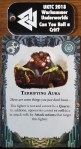 Terrifying Aura is a counter card of sorts. Prevents you from being a Quarry and opponents cannot re-roll dice from attack actions against you. Very defensive but strong when used correctly.