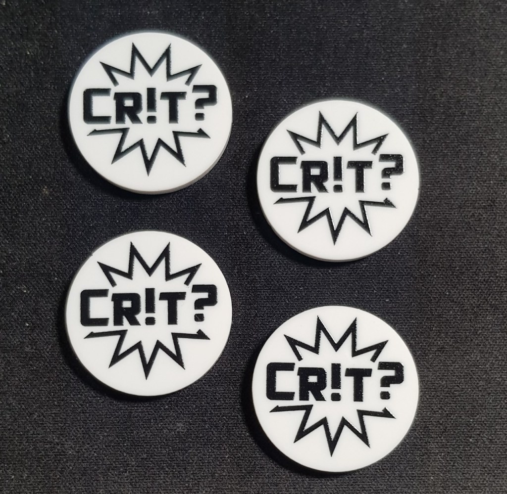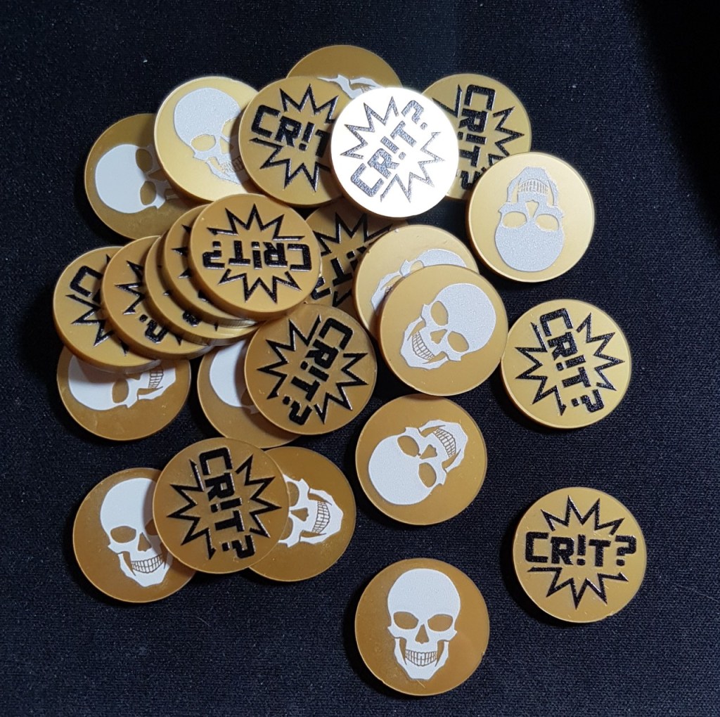 For the players who come 1st and 2nd, they will each get a set of 25 GOLD acrylic glory tokens. The front side has my Crit logo and the “spent” side has a skull image to denote when you’ve spent your precious GOLD glory.