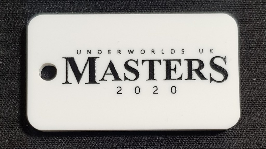 Each player will get a white acrylic dog tag (50mm x 28mm) commemorating the Underworlds UK Masters 2020 as well as 4 30mm white acrylic activation tokens. The reverse side is blank while the front has my Crit logo.