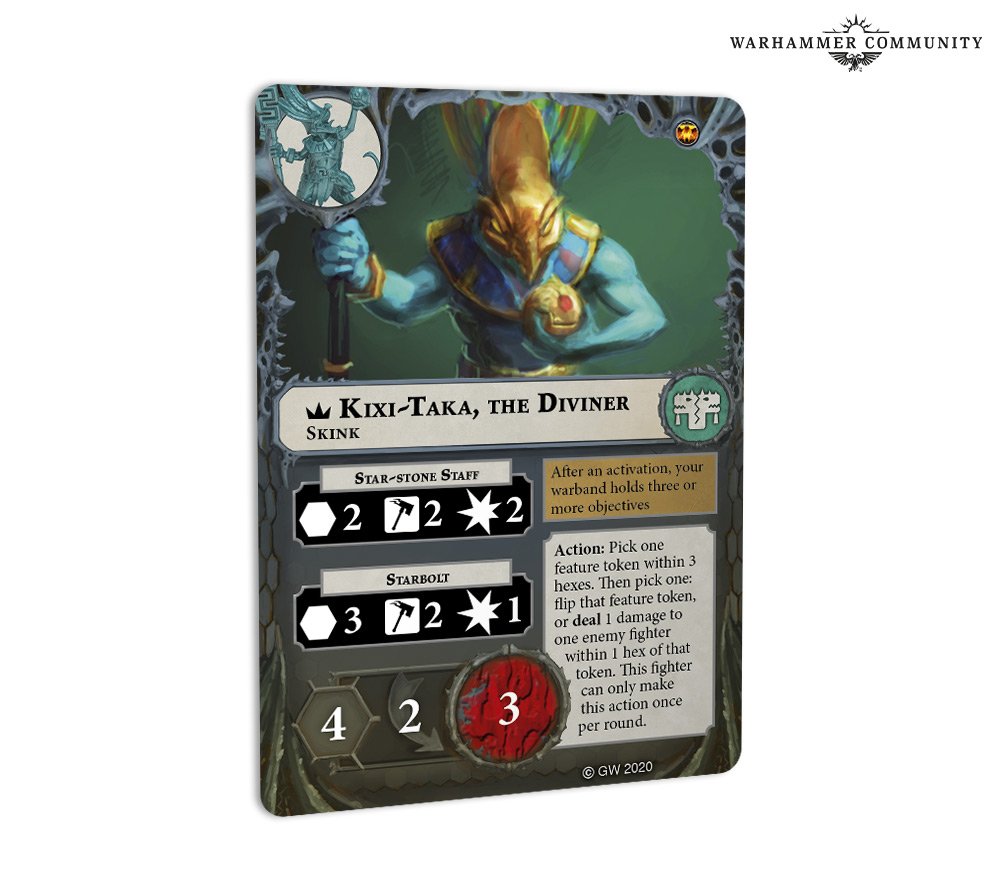 The first Visions of Glory article dropped for Warhammer Underworlds. This new series of articles is designed to show what’s coming ahead in the future for our game. For the first article, the Starblood Stalkers were revealed. The warband consists of a Skink Priest called Kixi-Taka, 3 Skinks, a Saurus and a Chameleon Skin. The warband was shown to have Asterism faction gambits which look like they mirror the Wurmspat’s Cycle gambit cards in terms of keyword naming.