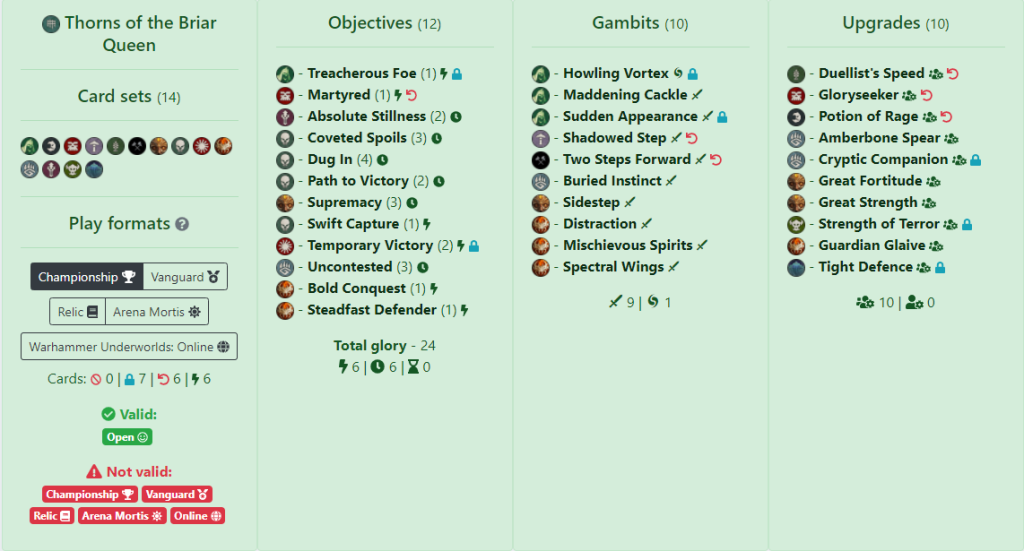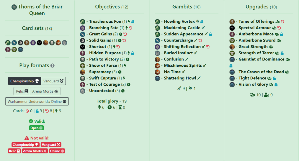 Gambits help bolster his playstyle via helping to ensure objective supremacy while also offering a slight tech into aggro with Endless Malice and Sitting Target when you need to clear an objective token. Unnatural Truce helps with card advantage, albeit at the cost of granting your opponent and extra card too. Upgrades function similarly to Mike’s deck with them focusing on staying on objectives while granting the Quarry keyword. Amberone Spear appears again as it has in previous decks due to its great ability at clearing 2 wound fighters for extra glory. Restrict cards are: Hidden Purpose, Temporary Victory and Sudden Appearance which make complete sense for a Thorns of the Briar Queen deck.