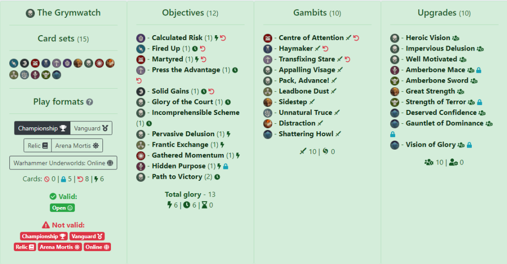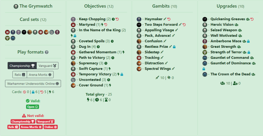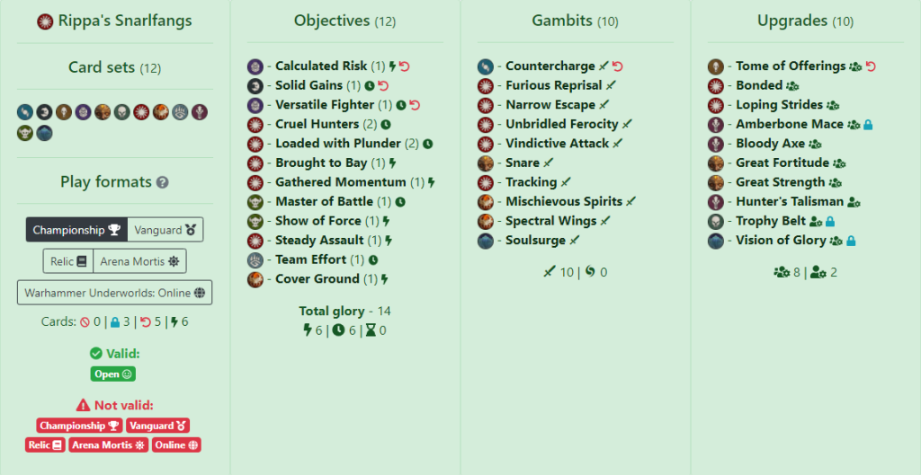 Gambits focus more on staying on objectives as David has taken a ton of push cards, both friendly and for disrupting the opponent. Haymaker appears once again, mainly for Gristlewell but also for when an attack is needed to go off, such as with Path to Victory. Spectral Wings and Tracking help with Cover Ground but also to get onto distant objectives as well as hiding enemy fighters. Upgrades have some push cards for objective play but the majority are aggro-based. Only 1 Amberbone weapon but there are enough modifiers in there to make Gristlewell or Crakkmarrow combat monsters. Restricted cards are In the Name of the King, Temporary Victory and Restless Prize. The first 2 are 4 Surge glory whereas the last is the most powerful objective push card in the game, flexible in either disruption or ensuring you stay on an objective.