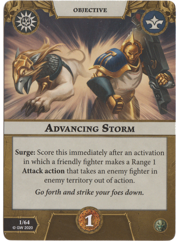 Advancing Storm is a Surge you score for taking an enemy fighter out of action with a range 1 attack action. Seems limiting on paper but your Thunderhead Greatbows help setup this and the warband has access to some decent range 1 attacks. Plus any good range 1 attack action upgrade will help here a lot.