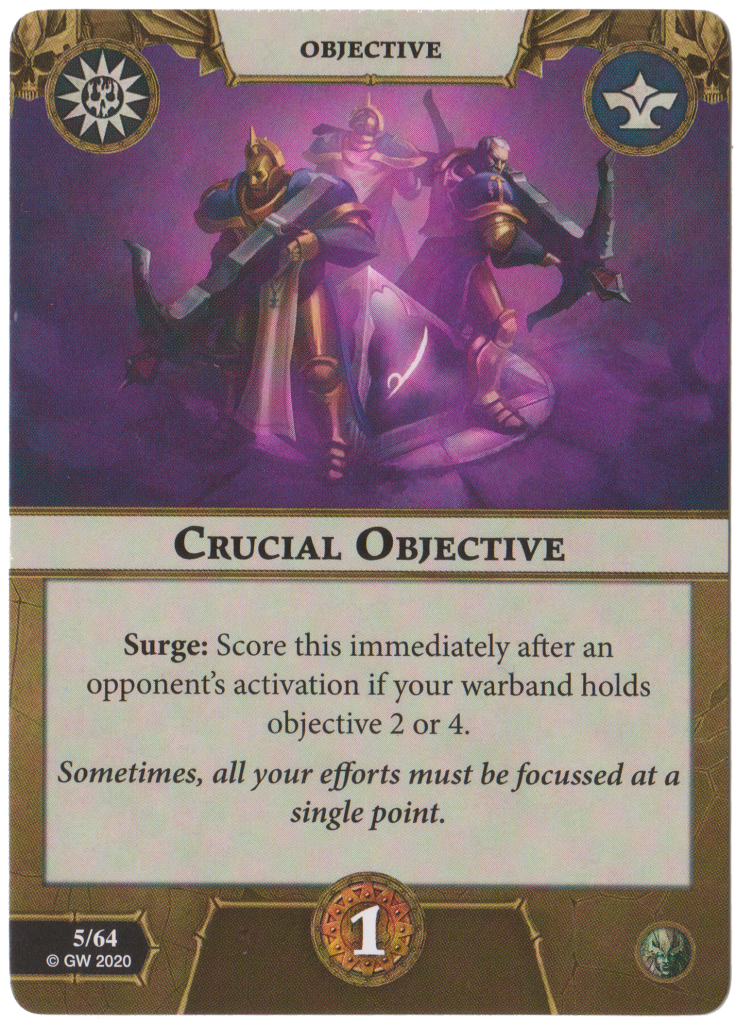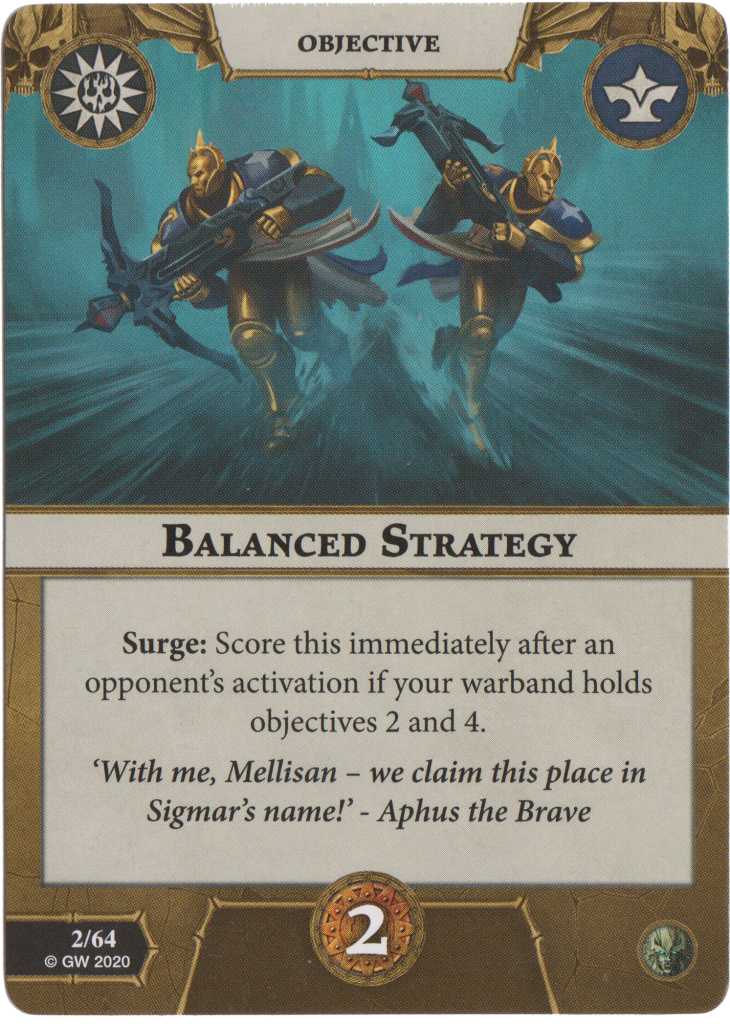 Balanced Strategy is a Surge you score after an opponent’s activation if you hold objectives 4 and 2 for 2 glory. It is a little difficult to score due to the fairer reaction window but that 2 glory is too good to pass up!