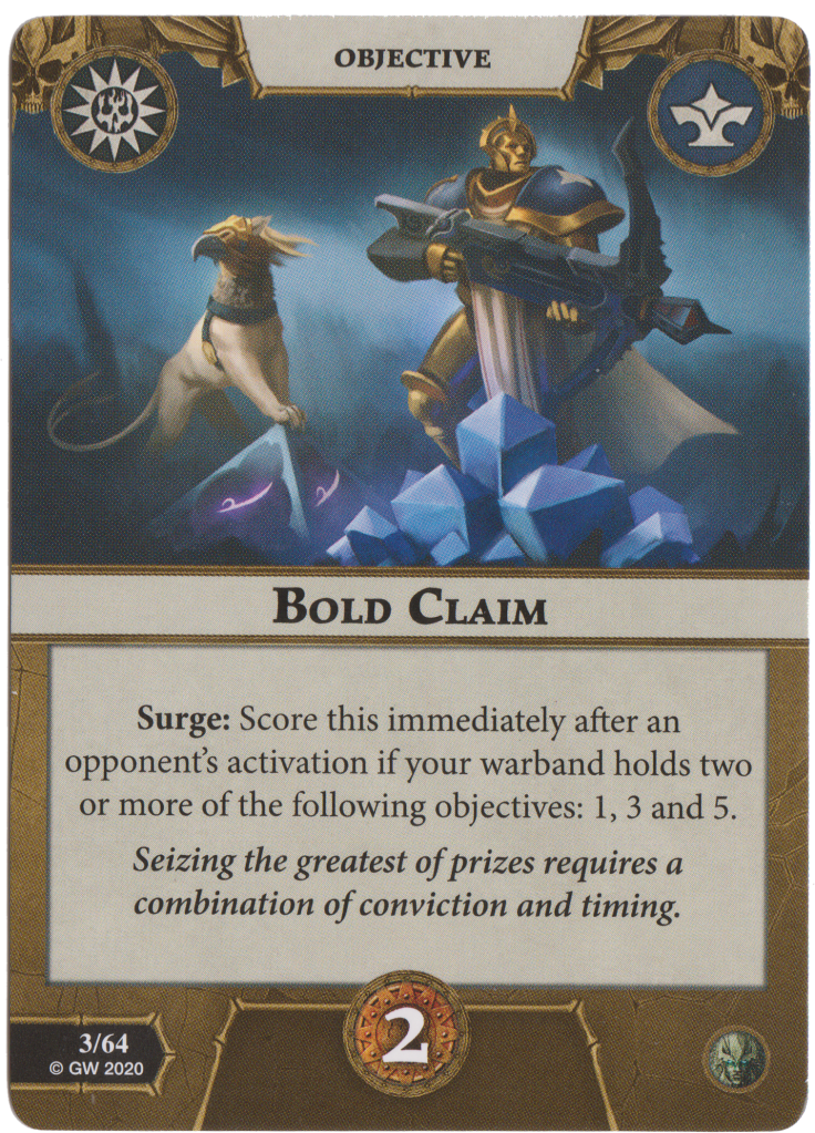Bold Claim is a Surge for 2 glory but if you instead hold objectives 1, 3 and 5 in any combination. This is easier to score than Balanced Strategy but you may want to just run Temporary Victory instead but this 2 Surge glory is just too tempting to pass for me. Needs investment for lots of Guard tech yet the payoff will be great.