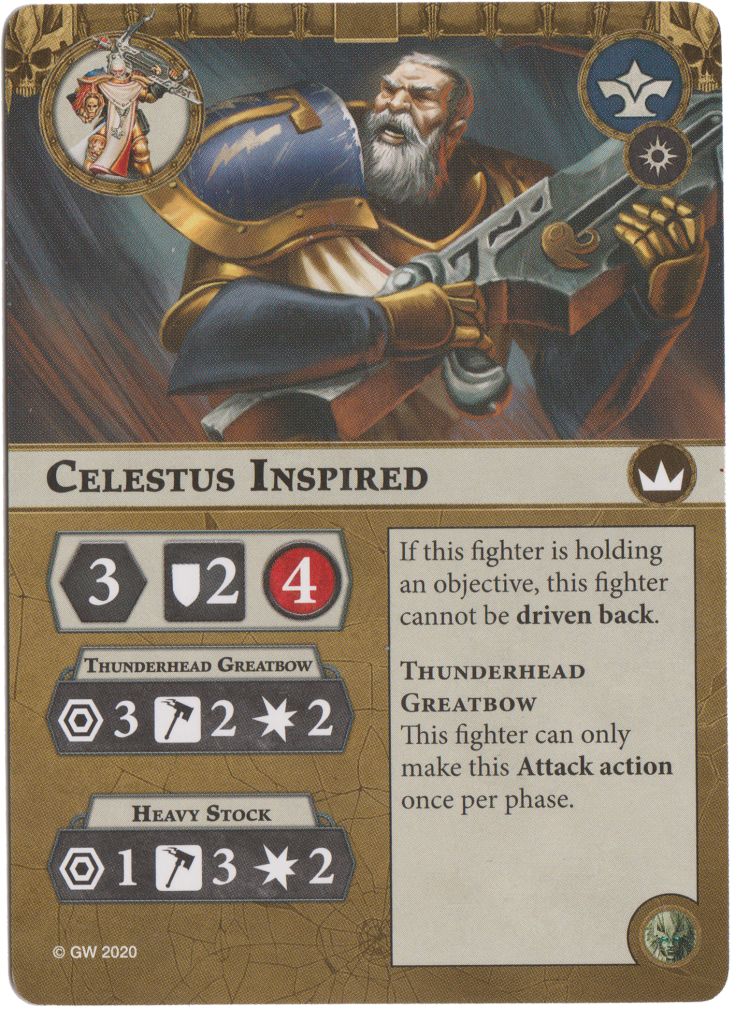 Celestus Inspired has his Heavy Stock increase to 3 smash. He gains 2 block and while he is holding an objective, Celestus cannot be driven back. It’s a nice inspired side and you generally want it for that 2 block.