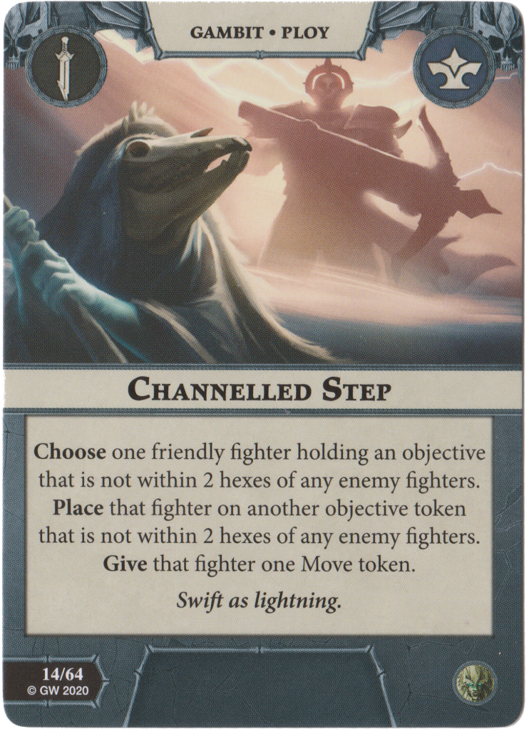 Channelled Step may sound confusing at first but is basically an objective teleport. You can only play this while holding an objective if there are no enemy fighters within 2 hexes, then place that fighter on another objective hex anywhere on the board as long as there are no enemy fighters within 2 hexes of that new objective. Has a lot of counterplay with the opponent by babysitting certain objectives but the mobility this card offers is amazing.