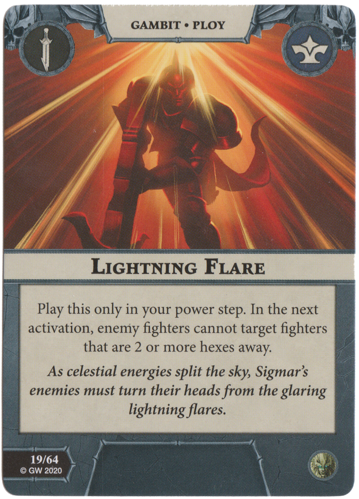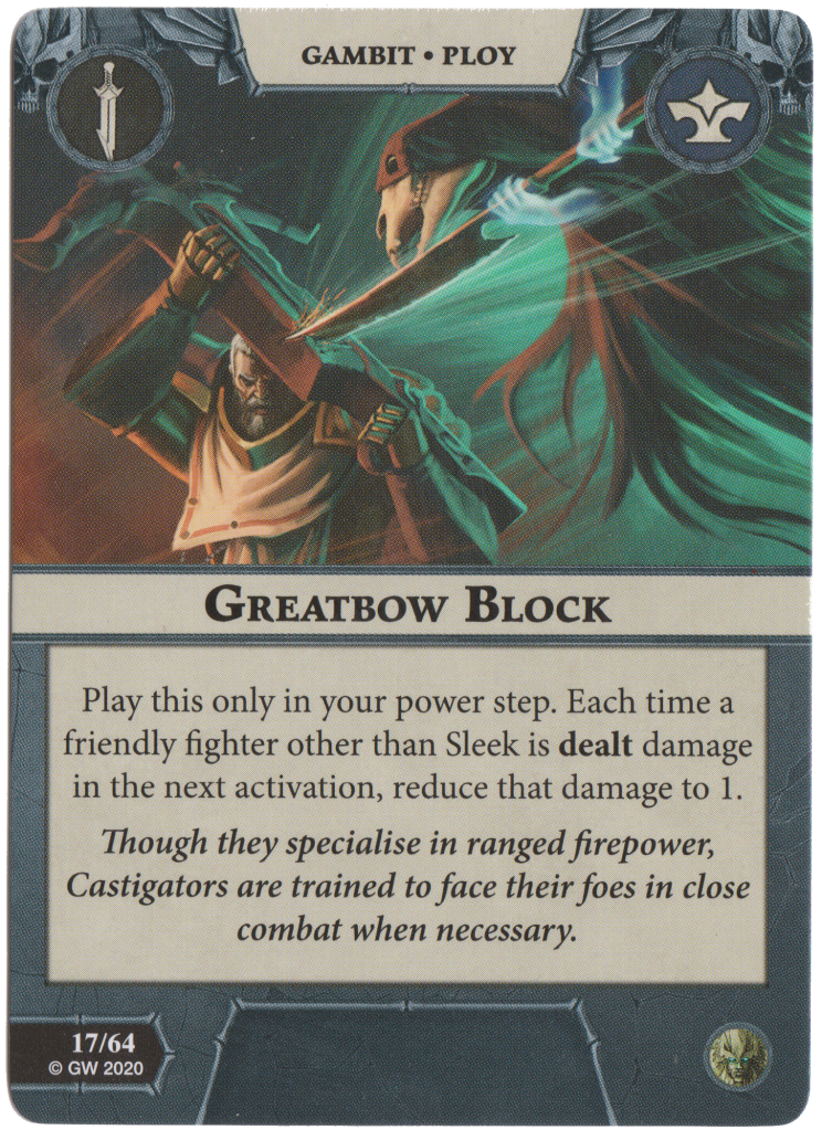 Greatbow Block reduces the damage dealt by 1 to any Stormcast in your opponent’s activation except for poor Sleek. This card becomes even better if Sleek is out of action as it is surprise damage negation that your opponent can’t really prepare for.