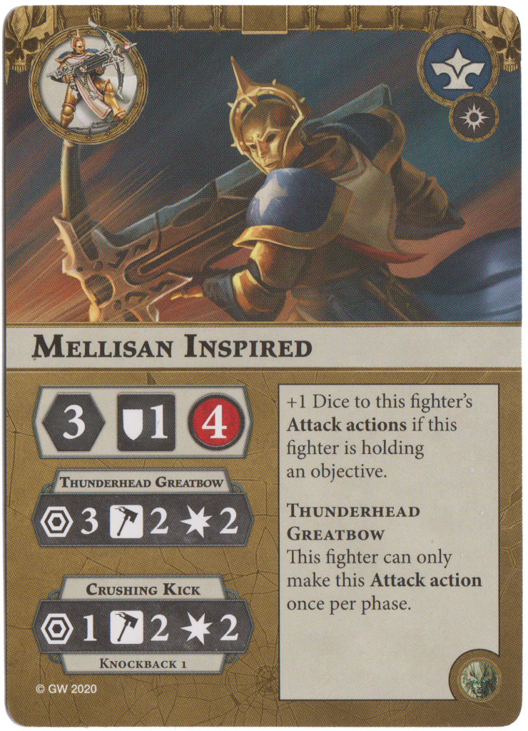Mellisan Inspired has her Crushing Kick increase to 2 damage with Knockback 1. She also gains the ability of +1 attack dice while holding an objective. This is so huge! 3 smash Thunderhead Greatbow but also any other attack action of her’s too. Super strong. She does remain at 1 block, however.