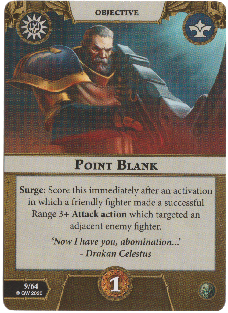 Point Blank. Pow! Right in the kisser! Fire any range 3+ attack action at an adjacent enemy fighter for 1 glory as a Surge if it is successful. Doesn’t even have to be a Thunderhead Greatbow attack! Simple and generally easy to score.