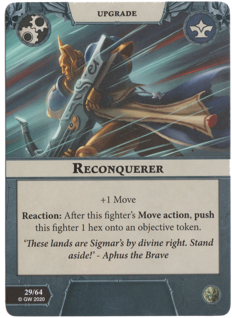 Reconquerer is Great Speed but lets you push the equipped fighter 1 addition hex as long as it finishes in an objective hex. Nice but Duellist’s Speed and Savage Speed give you more utility.
