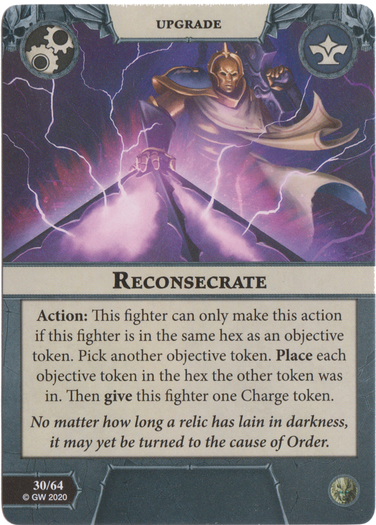 Reconsecrate is a better Shardcaller! As an action, the fighter can swap 1 objective token they are standing in, for another and then gain a charge token. This hugely improves the reliability of your objectives and can be used on Sleek!