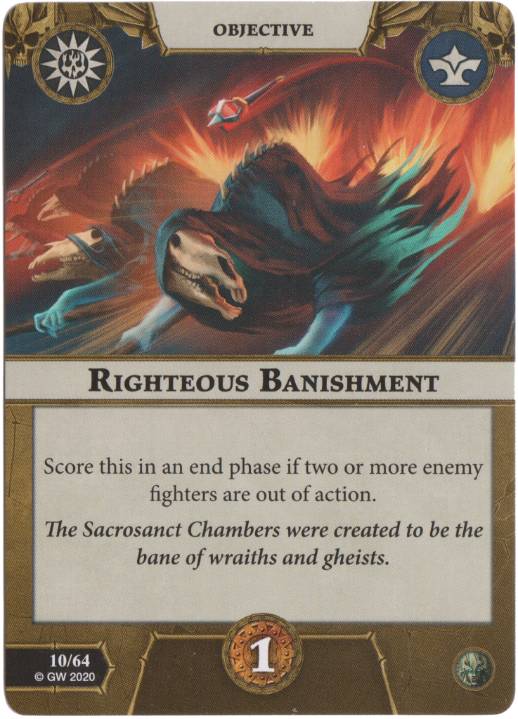 Righteous Banishment is 1 glory for having 2 or more enemy fighters out of action. Once again this is easy glory which the Storm of Celestus can score quite reliably.