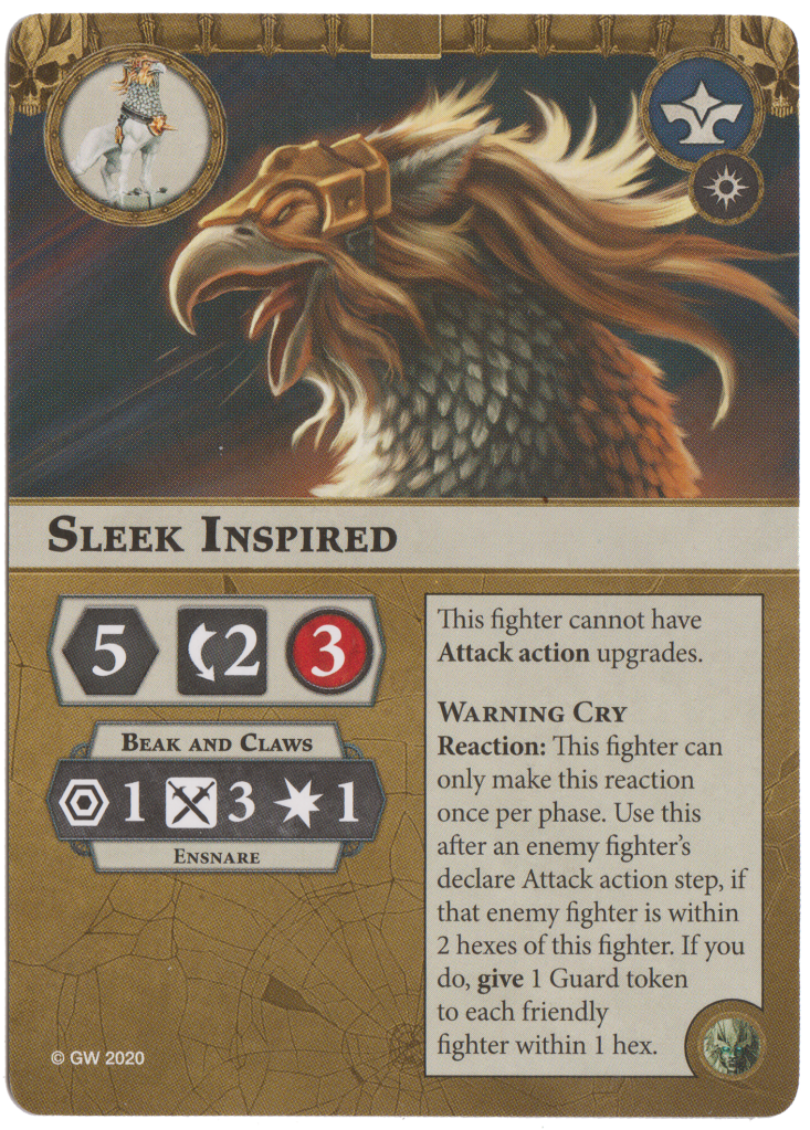 Sleek is your Gryph Hound, armed with Beak and Claws which are range 1, 3 fury and 1 damage. Sleek cannot have attack action upgrades but can, oddly, hold objectives. With his movement of 4, it makes him quite the speedy objective grabber. Sleek’s main power comes from his Warning Cry reaction ability. You can only make this reaction ability once per phase after an opponent declares an attack action while within 2 hexes of Sleek, you can then give 1 Guard token to each friendly fighter within 1 hex. This is really good, although requires lots of setup to give Guard tokens to everyone at once. Here is one setup that is doable (thanks Wathlab for the image):
