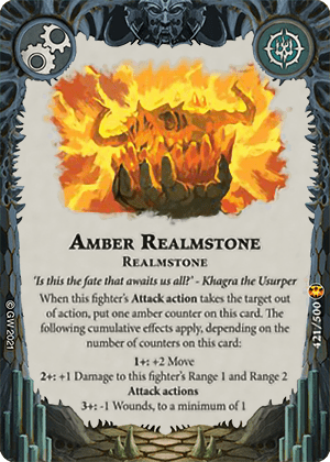 Amber Realmstone is a Realmstone card. Each time you kill an enemy fighter, place an Amber counter on this card. If a fighter has 1 Amber counter they gain +2 move, 2 Amber counters work like Great Strength and 3 or more Amber counters give -1 wounds. It’s fun and balanced but not really that helpful. Interesting for sure though.