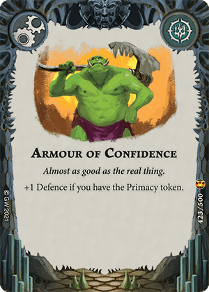 Armour of Confidence gives +1 defence if you have the Primacy token. This is soooo good as you can build some fearsome Primacy builds whether on the offensive or defensive.