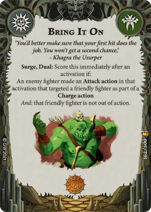 Bring it On is a Surge and Dual objective which you score for 1 glory after an enemy fighter charges you and doesn’t take you out of action. Buffed Too Dumb to Die! Amazing. Really solid, especially in the aggro meta of Direchasm.