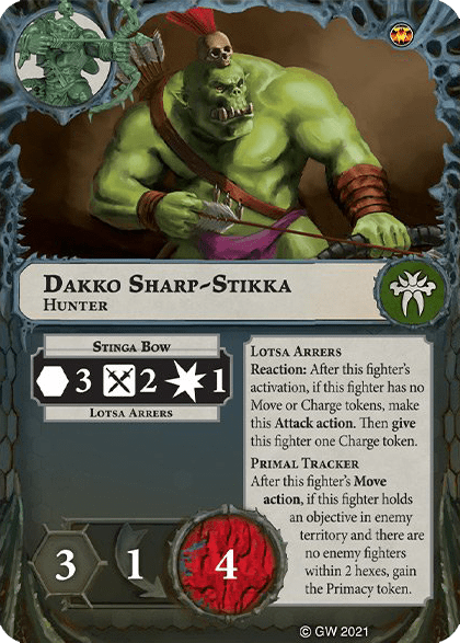 Dakko Sharp-Stikka is a Hunter and armed with the Stinga Bow. This is range 3, 2 fury and 1 damage with Lotsa Arrers. This reaction lets Dakko shoot again after an activation if he has no move or charge tokens but then he gains a charge token after this. His most important ability is Primal Tracker, although he oddly does not have the Primal Surge ability.