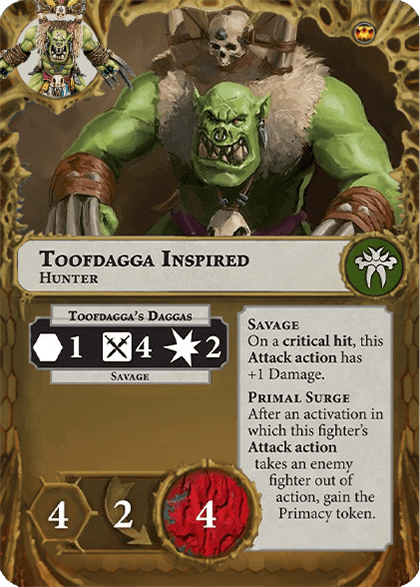 Each fighter has the Primal Surge ability which lets you gain the Primacy token after an activation when a friendly fighter takes an enemy fighter out of action. This is pretty awesome as it makes gaining the Primacy token much easier for Hedkrakka’s Madmob because you don’t have to worry about 1-shotting unwounded fighters or killing enemy leaders as the main way to get Primacy. Having an effective 4th way to get the Primacy token compared to all other warbands (excluding universal cards) makes Hedkrakka’s Madmob the Primacy warband!