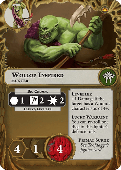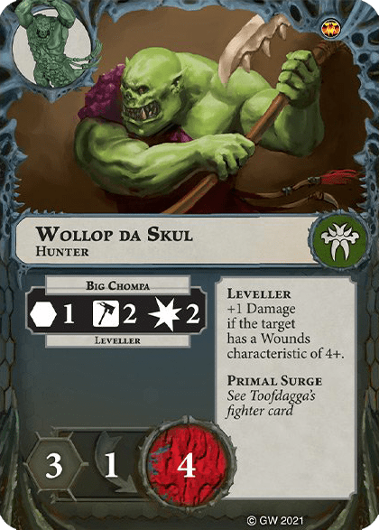 Wollop Da Skull is the muscle of the warband while also being a Hunter. He is armed with his Big Chompa which is range 1, 2 smash and 2 damage with Leveller. This ability grants the Big Chompa +1 damage against enemy fighters with 4 or more wounds. With a single +1 damage upgrade he becomes a menace to all 4 wound fighters.