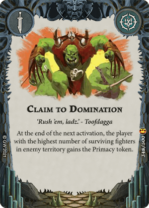 Claim to Domination is a nice way to gain Primacy. At the end of the next activation, gain the Primacy token for having the most fighters in enemy territory. A really good Primacy backup for aggro players but you either need to be playing against elite warbands or have mauled your opponent’s fighters.