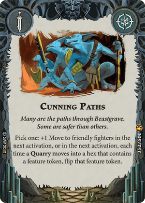 Cunning Paths is extra sneaky. Chose to either give +1 move in the next activation OR have a Quarry flip a feature token each time they move into one. Amazing flip and Feed the Beastgrave support. Slakeslash just became even more of a problem!