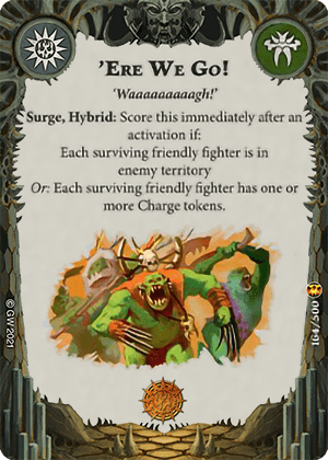 ‘Ere We Go! is another great Surge and Hybrid which you score after an activation where all friendly fighters are in enemy territory or have 1 or more charge tokens. Reliable with multiple ways to score.