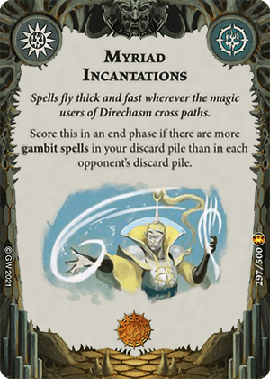 Myriad Incantations is only good if you’re a magic-heavy user. 1 glory for having more gambit spells in your discard pile than your opponent. Considering how rare magic is, this is another great objective for 1 easy end phase glory.