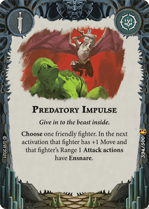 Predatory Impulse is another great aggro tool. One friendly fighter gains +1 move and range 1 attack actions gain Ensnare in the next activation.