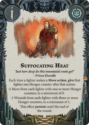 Suffocating Heat is an amazing Hunger tool. After any fighter makes a move action, they gain a Hunger counter. If fighters have 1 or more Hunger counters, they get -1 move down to 0. If they have 3 or more Hunger counters, they are at -1 wounds. This persists till the end of the round but it is amazing Hunger generation, especially for the Crimson Court.