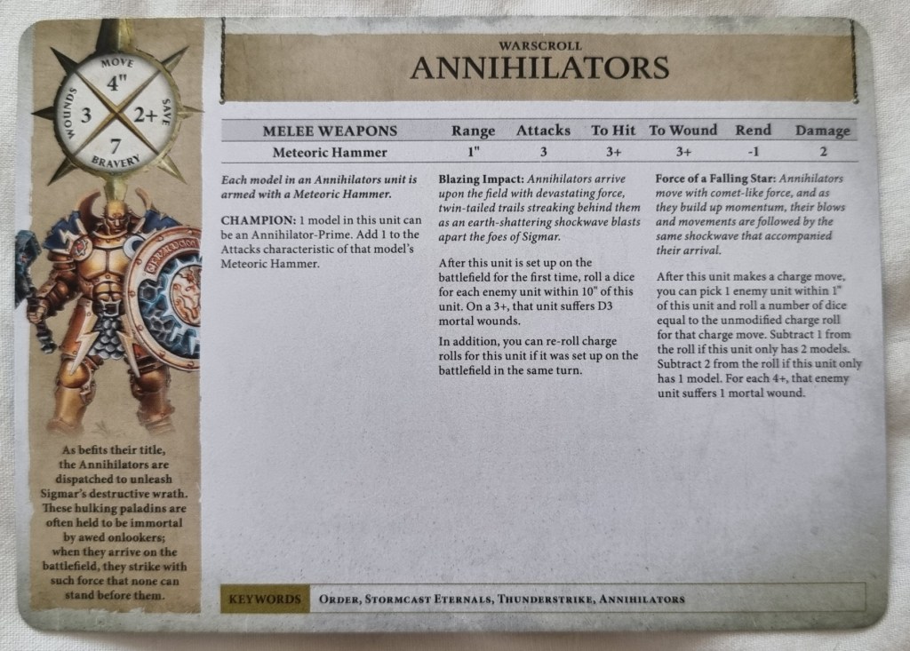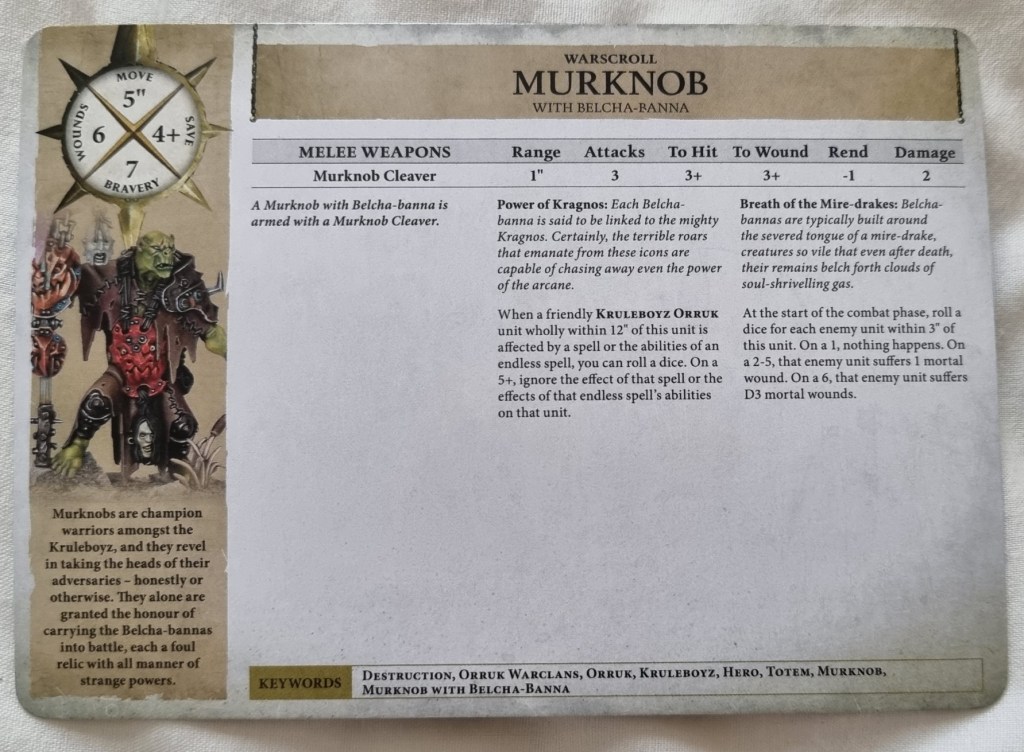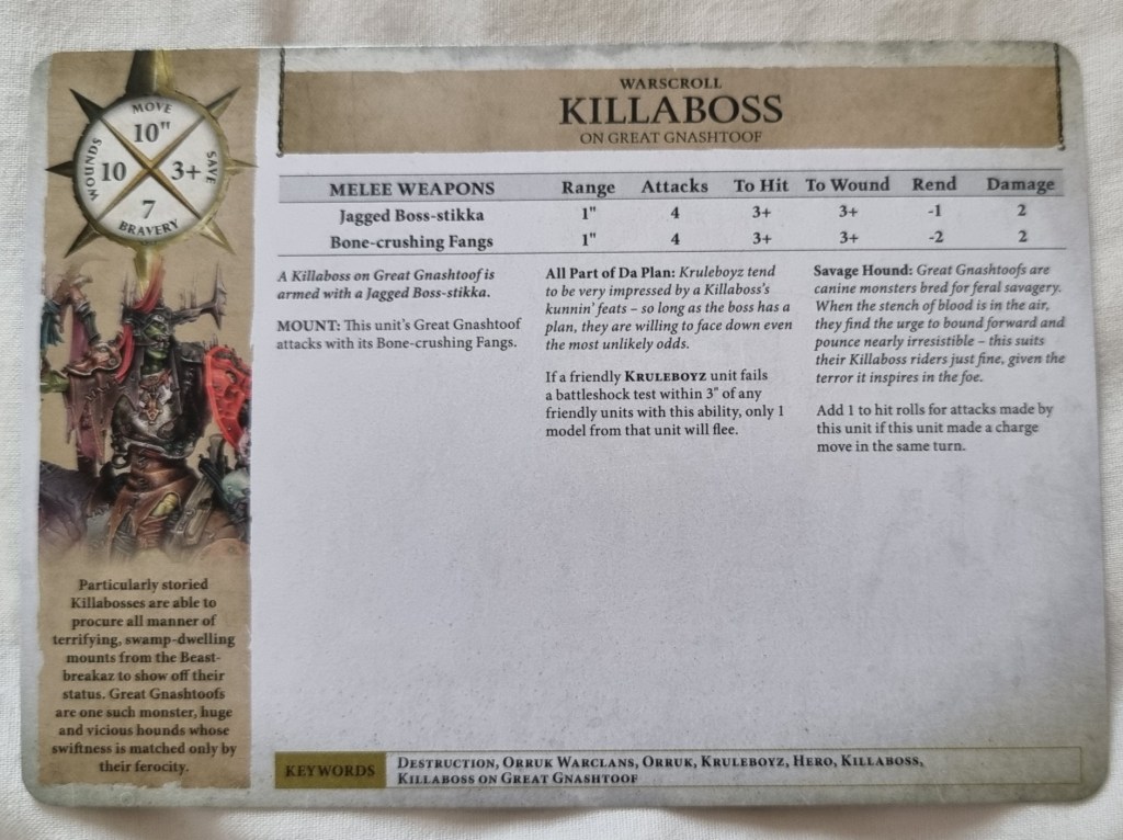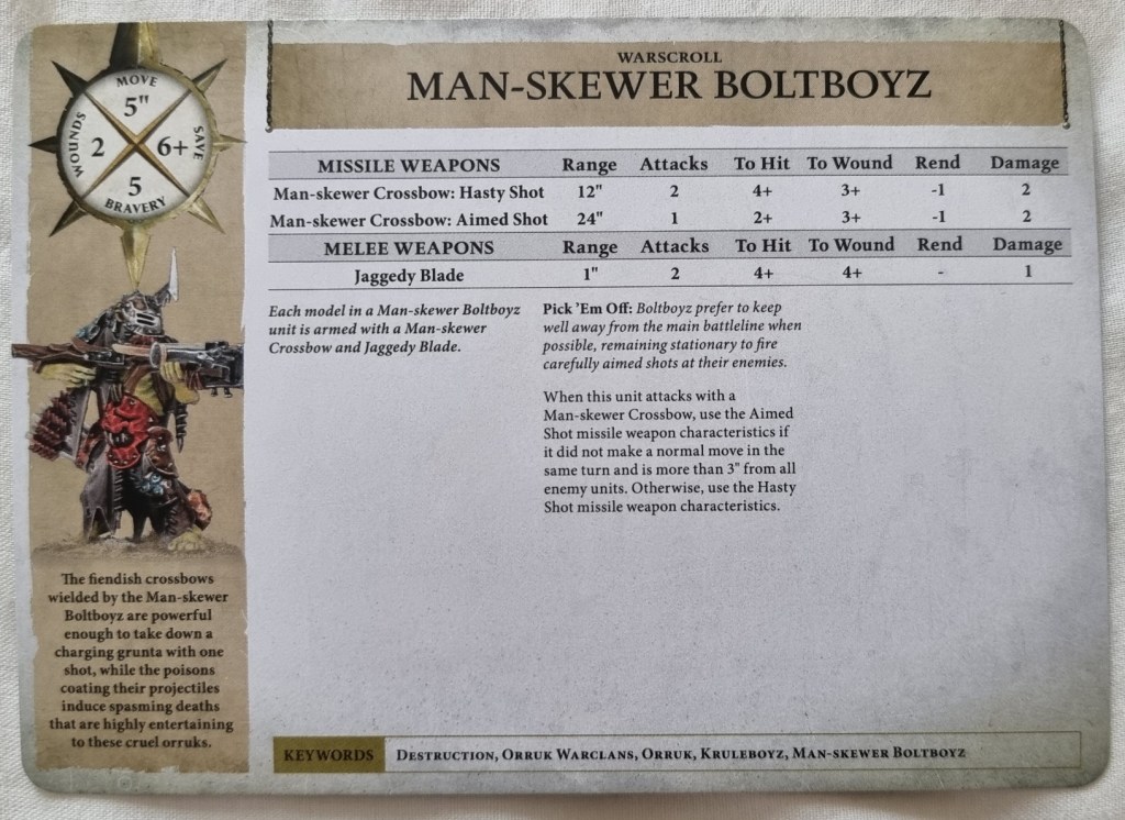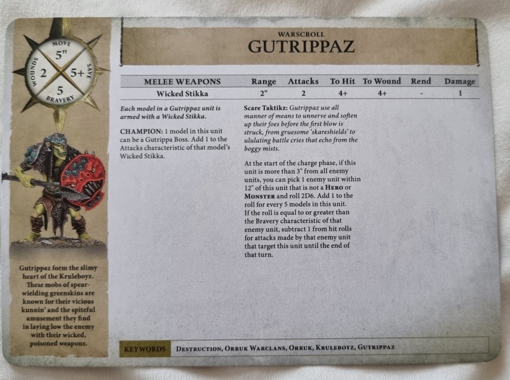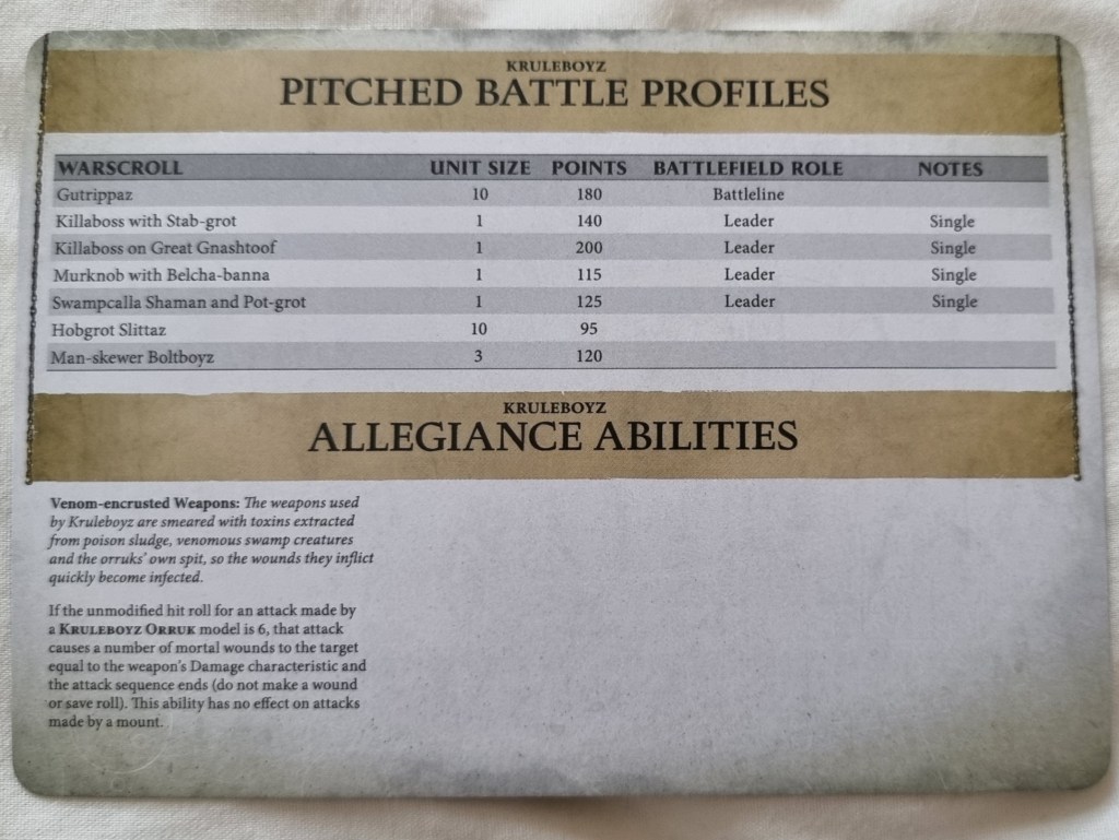 Within the Dominion box you get all the rules needed for both factions. All their rules are found on their warscroll cards with each army having their own warscroll card for points. I love the warscroll cards for Age of Sigmar so this is a plus for me. The Stormcast have the ability to deepstrike during the game and potentially explode when killed whereas the Kruleboyz can do mortal wounds (damage that ignores armour saves) instead if they roll a 6 to hit thanks to their sneaky poisons. The Stormcast also have better armour saves whereas the Kruleboyz have almost no armour but makeup for that in numbers.