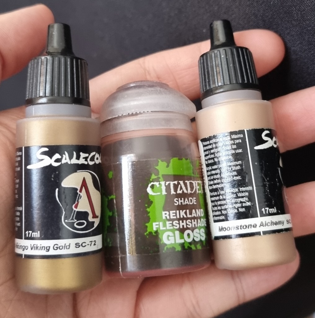 Gold was the next big colour to block in. I keep changing how I paint gold now but the above image is my “shiny gold” scheme. I basecoat with Scale 75 Viking Gold, wash with Reikland Fleshshade Gloss then edge highlight with Scale 75 Moonstone Alchemy. I use the gloss wash in order to not dull down the gold, the finish looks weird but I will use a matte varnish to tie everything together in the end. If you don’t plan on varnishing, you can just use normal Reikland Fleshshade instead.