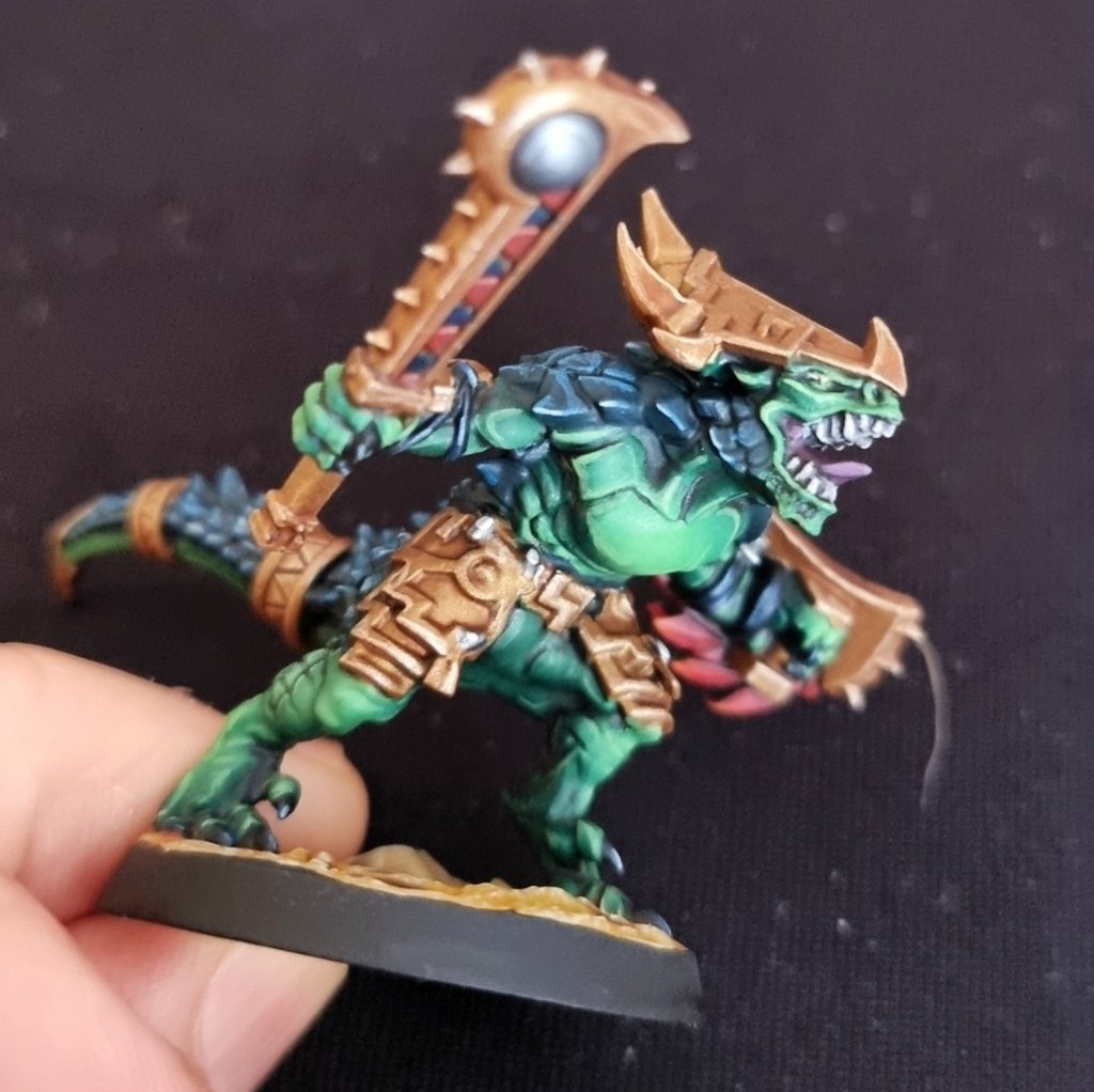 The eyes I painted yellow with black slits. They just look so good for animals. Tongues were all painted purple too for more contrast. Skink skin-flaps were basically painted pale orange for contrast as well. Klaq-Troq’s zigzag red and blue triangles were just painted with 3 coats of red and blue contrast paint respectively. I would have done it on Kixi-Taka too but I almost went mad blocking those colours in on Klaq-Troq. Took forever as any errors would have ruined the technique.