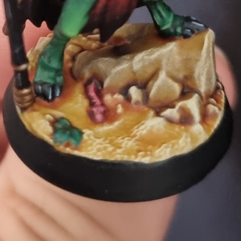 Bases were done next. As you may know, I keep basing the same across all my Warhammer Underworlds warbands to tie them together as all fighting in the same place. It represents fighting in the sandy desert on the edge of Shadespire. I basecoat everything with Zandri Dust, wash Casandora Yellow, wash any rocks with thinned Agrax Earthshade then drybrush everything with Ushabti Bone and you’re done! Simple, fast and effective. Once this is all done, then I just paint any other random base details with appropriate colours like a military green for plant life and purples/reds etc for small animals.