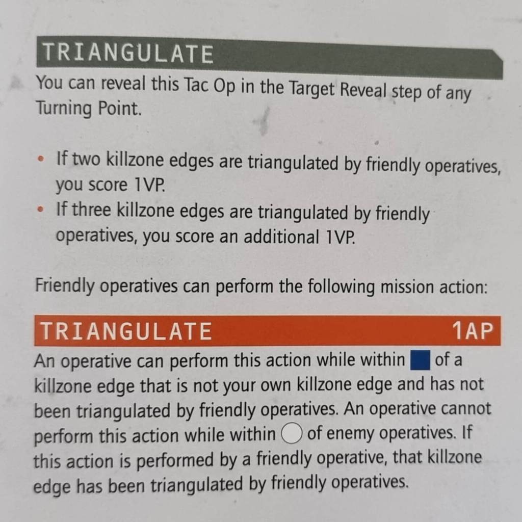 Triangulate is revealed during any turning point. Triangulate 2 killzone edges for 1 VP, do 3 for another 1 VP. Triangulate is 1 AP for performing while within blue of a killzone edge that is not your own and has not already been triangulated. You cannot do this while within white of the enemy.